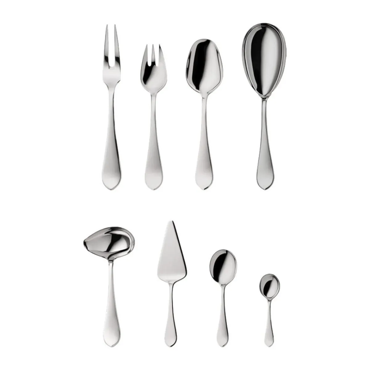 2 x große Fleischgabeln, 1 x Gemüselöffel, 1 x Gemüsegabel, 1 x Servierlöffel, 1 x Saucenlöffel, 1 x Tortenheber, 1 x Zuckerlöffel und 1 x Tassenlöffel.
