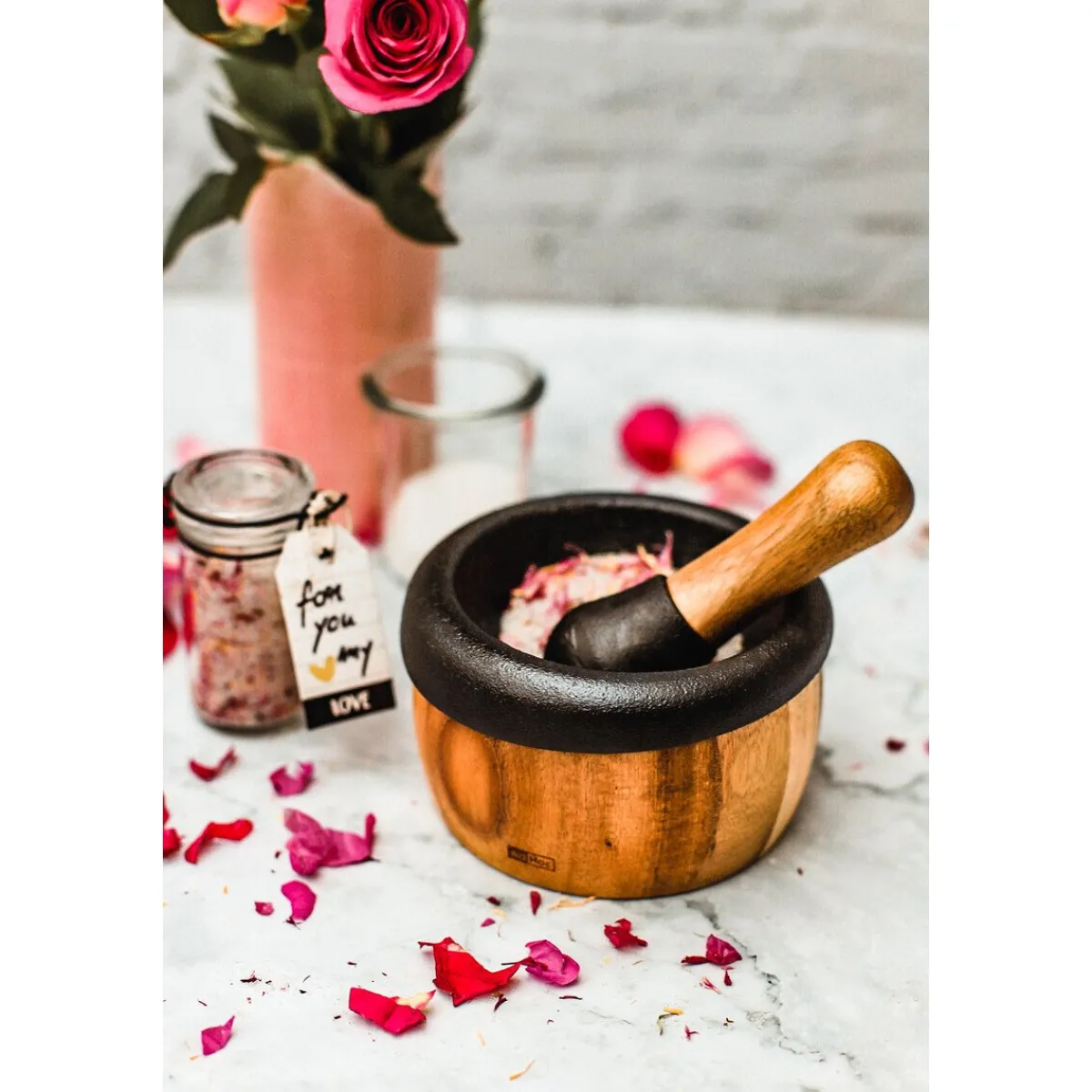 - besteht aus einem Stößel (12,5×4,2 cm) und einer Schale (13×7,5 cm)