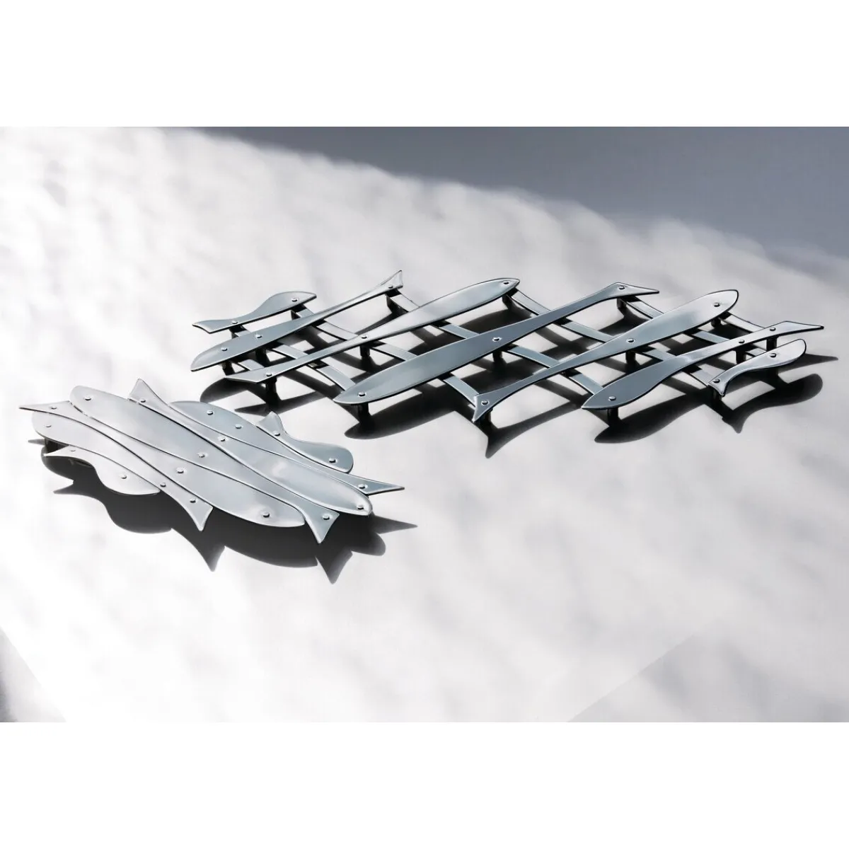 Der originelle Topfuntersetzer Pescher von Alessi ist die passende Ergänzung für alle Lieblingstöpfe. Er besteht aus glänzendem Edelstahl und besitzt die Maße 19x12x51 cm. Das wohlgeformte Design erinnert an lustige Fische, die auf einem Rost liegen. Sie sorgen für genügend Stabilität des Topfes. In geselliger Runde ist dieser repräsentative Edelstahluntersetzer nicht nur ein grandioser Eyecatcher. Er schont zudem die empfindliche Tischplatte, falls es beim Essen heiß hergehen sollte.