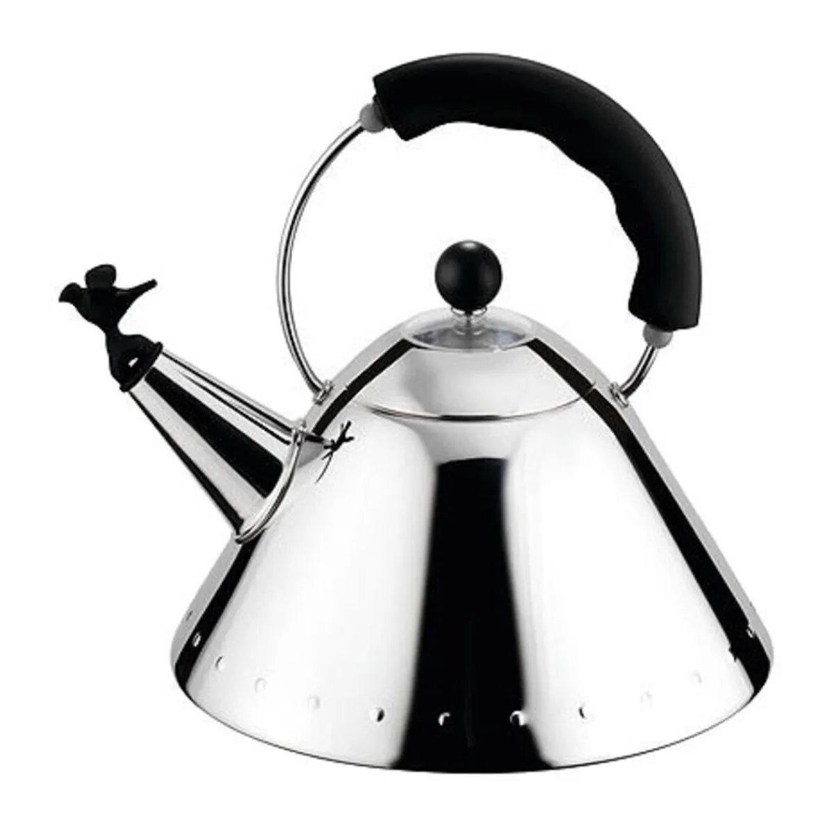 Der Körper ist aus poliertem Edelstahl, der Griff und das Vögelchen sind aus thermoplastischem Harz geformt. Der Vogel springt auf und fängt an zu pfeifen, sobald das Wasser im Kesselinneren kocht. So bringt er schon seit 1985 seine Fans zum Lächeln. Weitere Stücke in ebenfalls geometrischen Formen wie Zuckerdose, Rahmkännchen, Salzstreuer, Pfeffermühle und dem beliebten Kitchen Timer sind heute echte Kultobjekte.