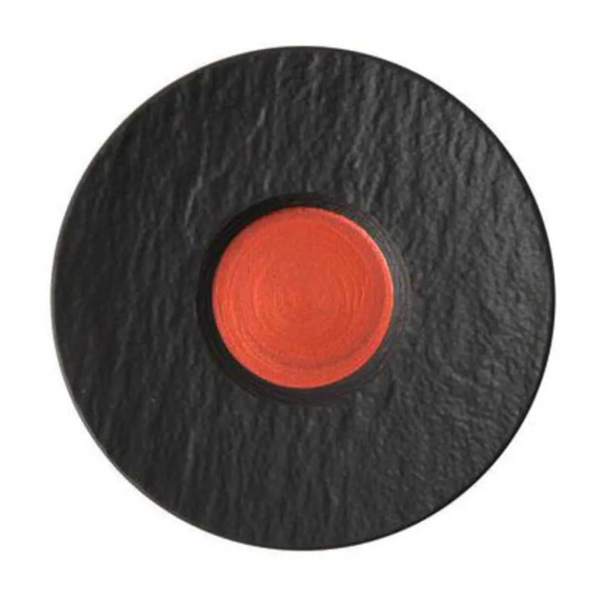Die Café au Lait Untertasse aus der Serie Manufacture Rock Glow von zeugt von Lebendigkeit und agiert mit ihrem markanten Look gegen jede Art von Langeweile auf der Tafel. Das schwarze, schieferähnliche Erscheinungsbild wird von einem Mittelpunkt im Kupferton akzentuiert und zieht so die Blicke auf sich.