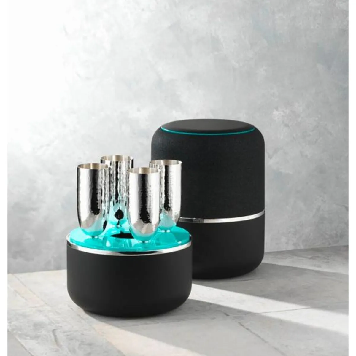 Mit der Champagner Box aus der Serie Dante von wird Champagner auf eine facettenreiche Art präsentiert. Die vier Kelche, die sich in der Box befinden, begeistern mit ihrer klaren Linienführung und der äußerst glatten Oberfläche, die das Silber zur glänzenden Vollendung bringt.