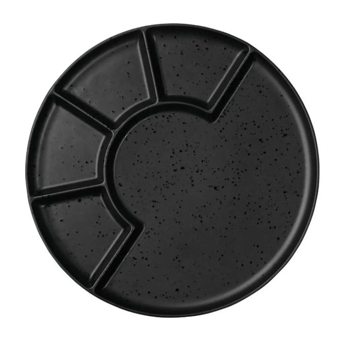 Der Fondueteller Coppa Kuro von eignet sich mit seinen Unterteilungen für Fondueabende, Grillpartys oder Antipasti-Vorspeisen. Mit seinem mattierten Look und seinen einzigartigen Facetten wirkt der Teller auf der Tafel einladend und verführerisch. Die Mattierung des Porzellans kann durch die Nutzung von Besteck zarte silberne Spuren erhalten. Genießen Sie die Gemeinschaft bei einem guten Essen mit diesem Geschirrstück.