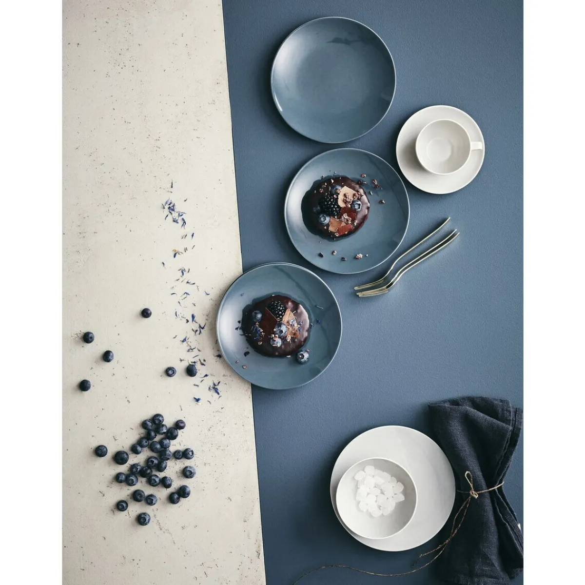 Mit dem Frühstücksteller TAC Sensual Comfort Blue von werden Croissants und Brötchen von einem pudrigen Dunkelblau umgarnt. Ein filigraner Grauton bereichert die Konzeption und sorgt für einen entspannten Ausdruck des Porzellanscherbens, wodurch auch Ihre Lebensmittel gekonnt inszeniert werden.