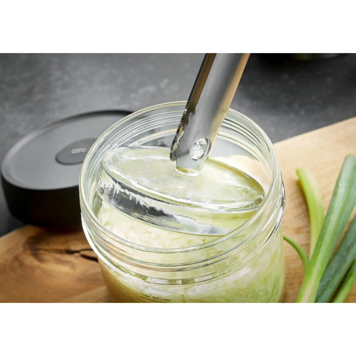 - 1 Fermentationsglas mit Deckel, 1 Gewicht, 1 Stößel und 1 Zange