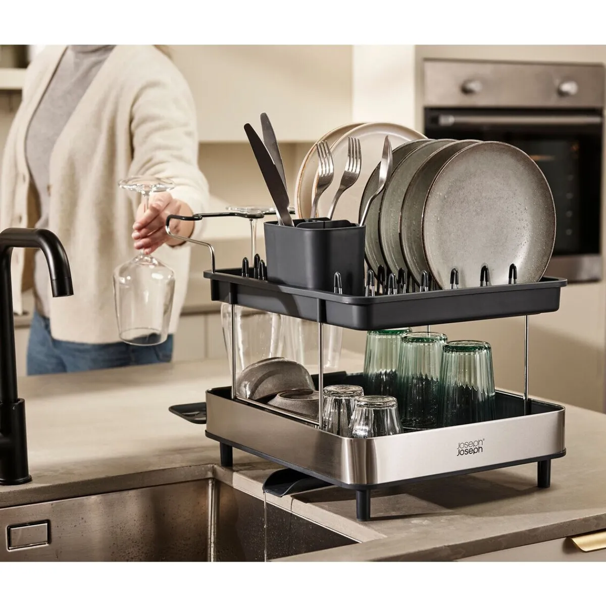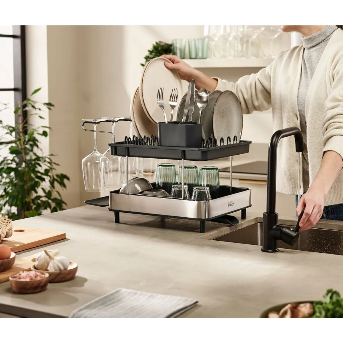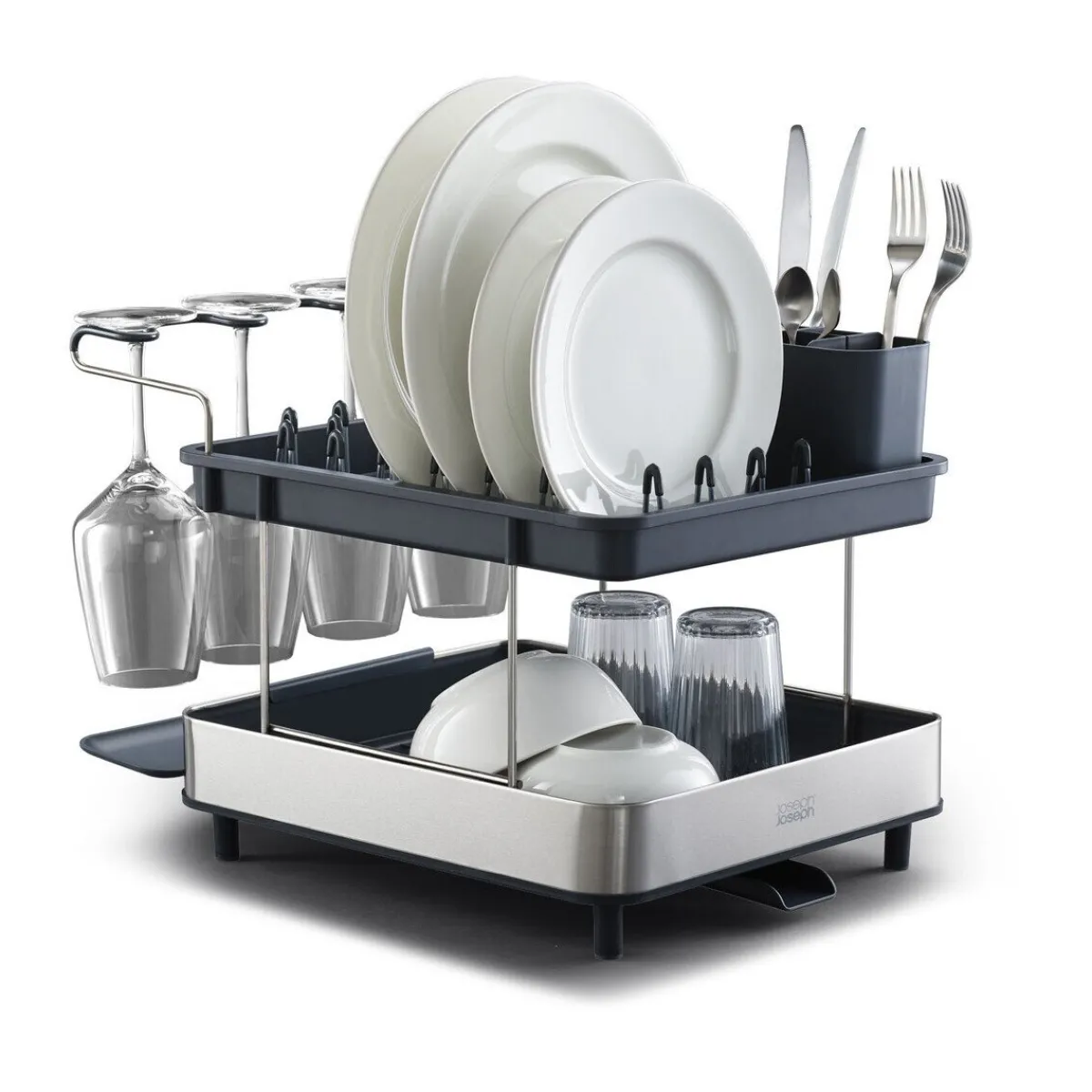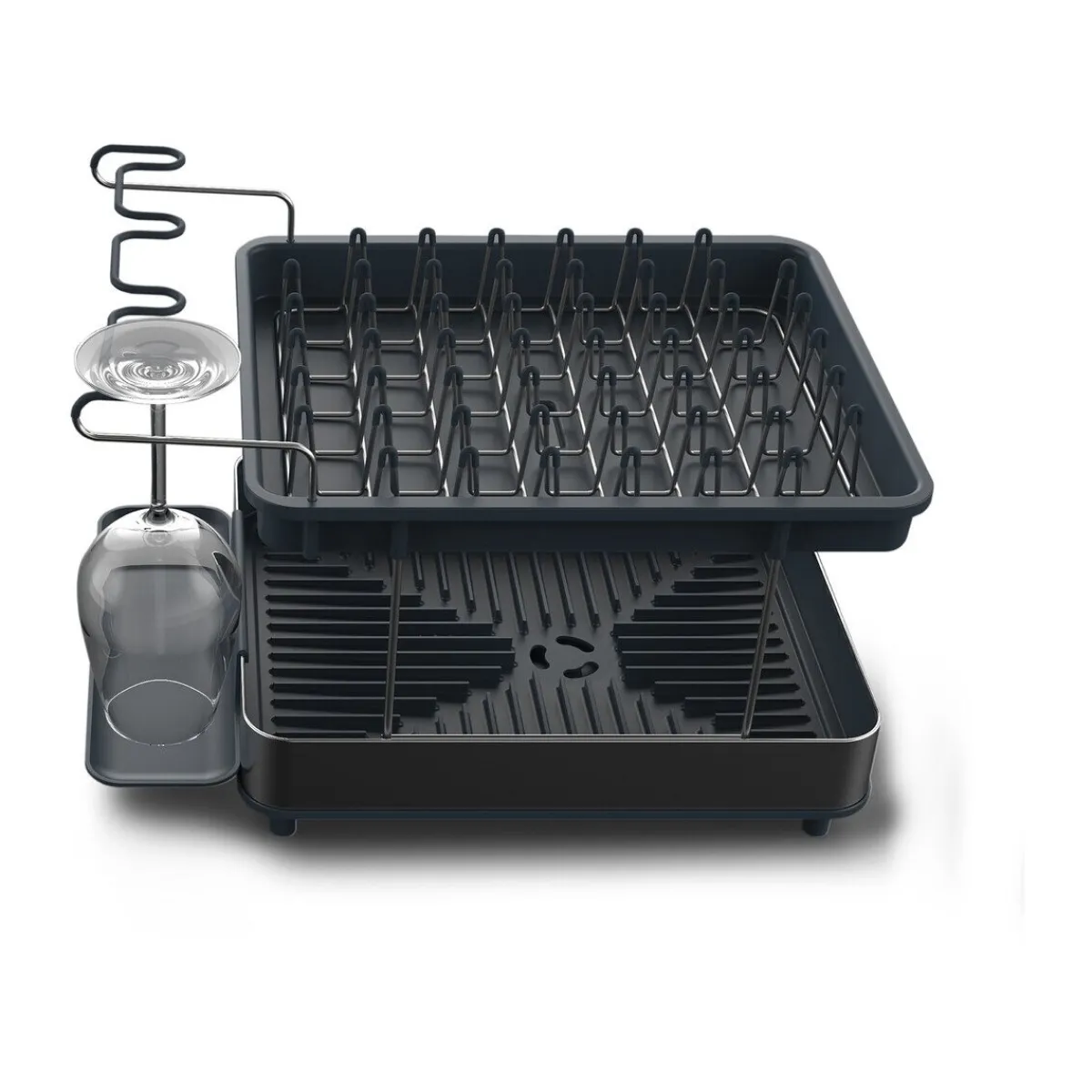 Die Geschirr-Abtropfschale Excel von ist ein pfiffiges Tool, das Ihnen viel Tropffläche beim Spülen bietet. Das zweistufige Design ermöglicht mehr Geschirr auf weniger Platz, während der clevere Weinglashalter separiert von den anderen Geschirrstücken bis zu vier Weingläser fassen kann. Lassen Sie Ihre Teller, Gläser und Ihr Besteck in diesem Abtropfgestell schnell trocknen, ohne dass sich das Wasser um die Stücke herum staut.