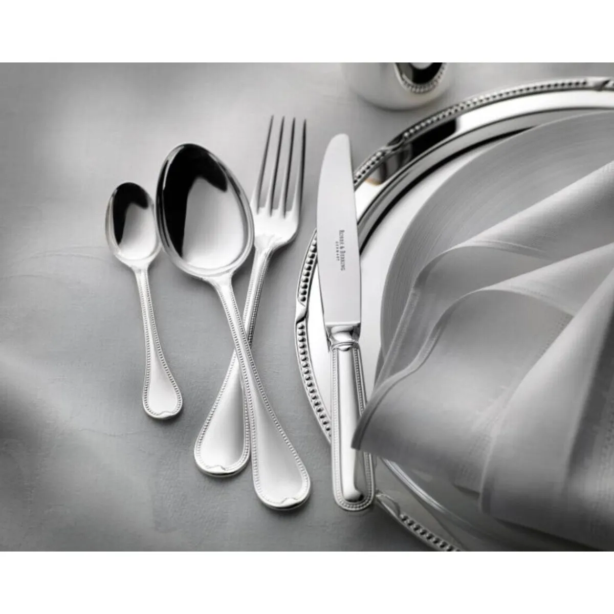 Das Menübesteck-Set Französisch-Perl von wirkt mit den zierlichen Perlen, die sich um das Besteck ziehen und plastisch ausgearbeitet sind, wie ein kunstvolles Erbe des Rokoko. Diese beschwingte Leichtigkeit wird von einer ausdrucksstarken Klarheit untermalt, die sich in der eindeutigen Formsprache zeigt und Ihrer Tafel einen anmutigen Charme verleiht.