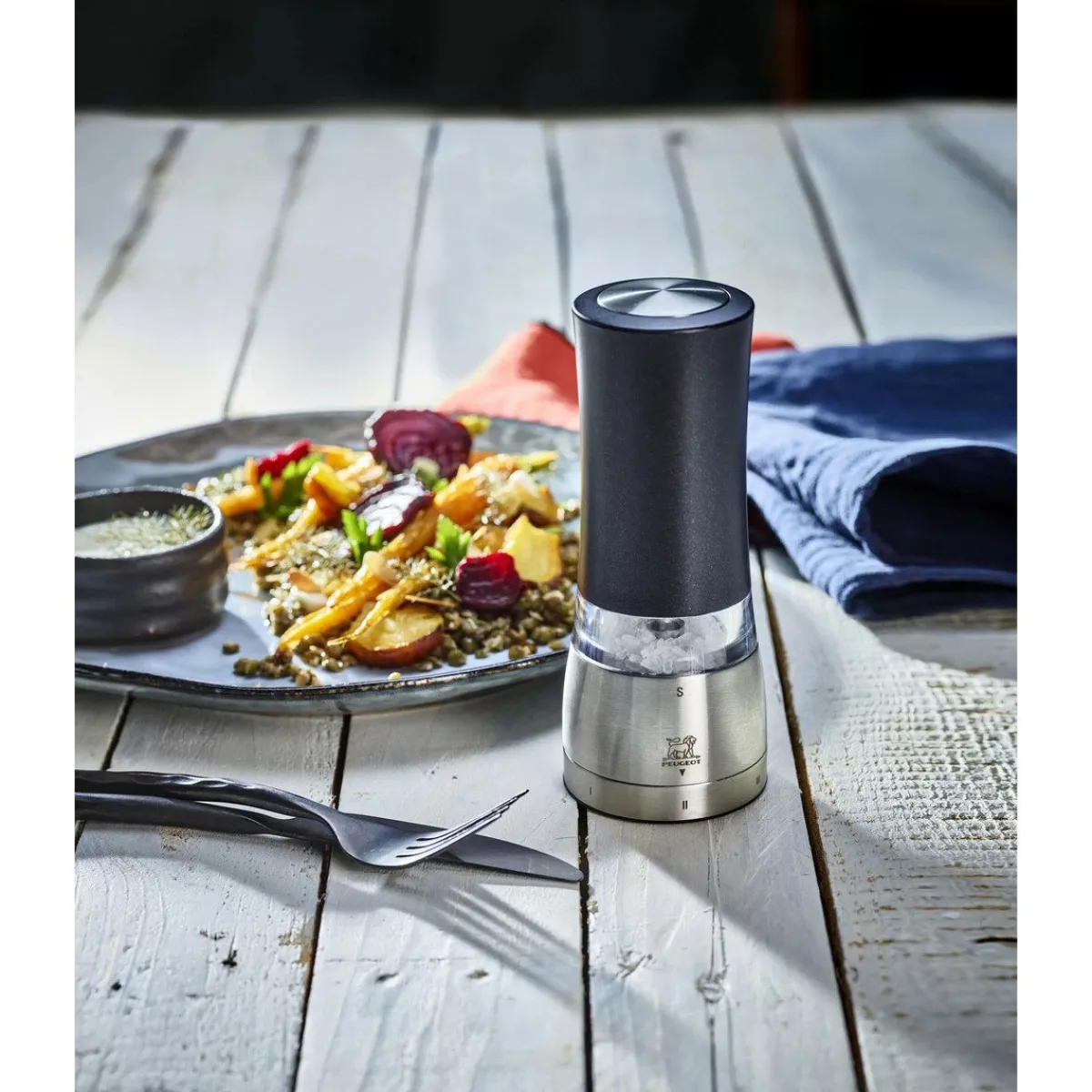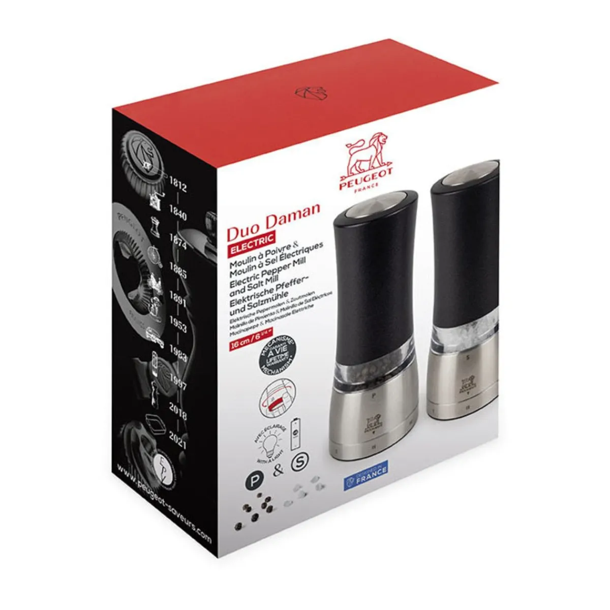Die Pfeffer- und Salzmühlen Daman Elektrisch von kommen im praktischen Duo daher. Für Peugeot typisch sind sie mit dem u’Select-System ausgestattet, das die präzise Einstellung des Mahlgrades zulässt. Mit nur einem Knopfdruck lassen sie sich mit einer Hand bedienen und zeigen durch ihre pfiffige Beleuchtung genau mit wie viel Pfeffer oder Salz Sie gewürzt haben.