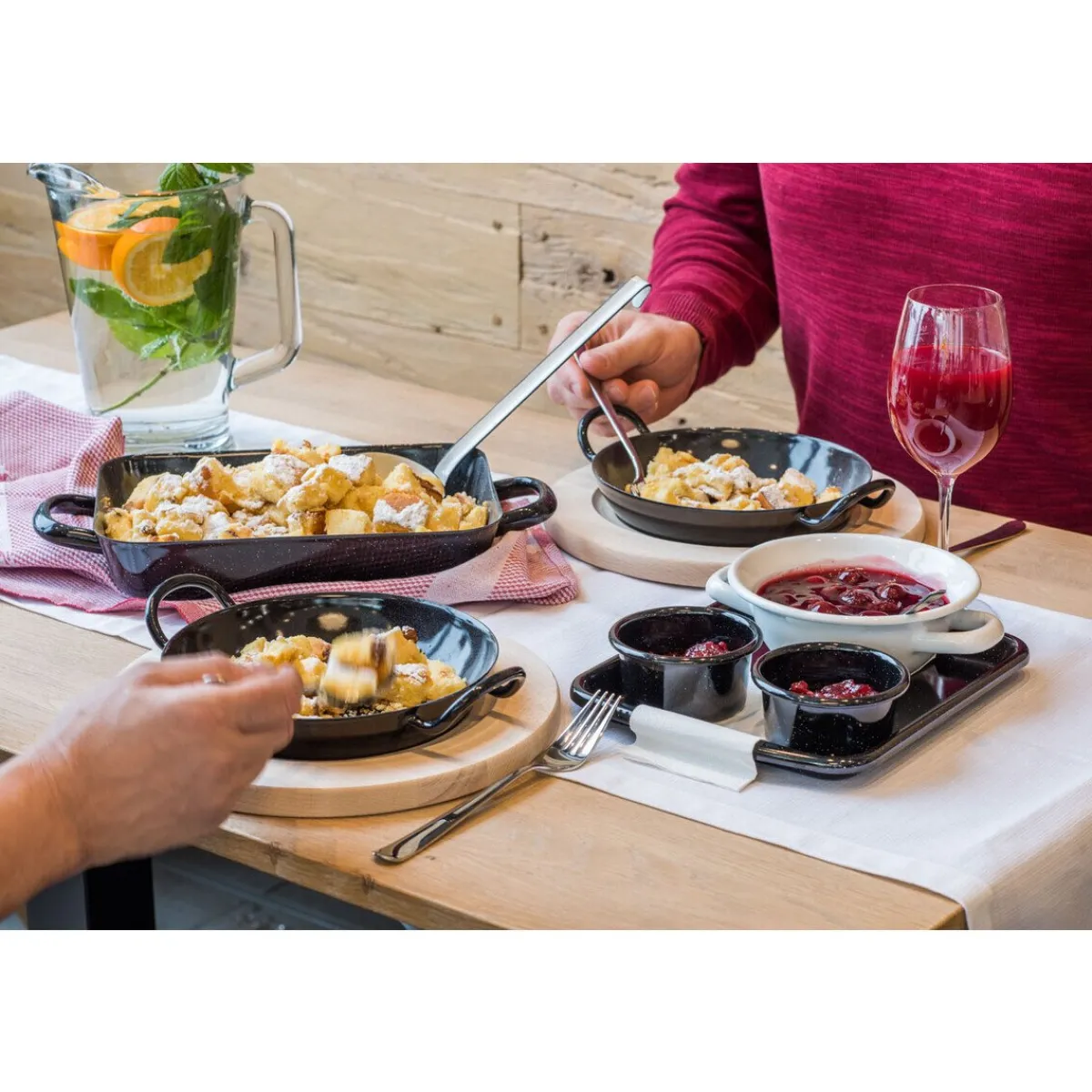 Die Schlemmerpfanne eignet sich besonders für Gerichte, die in der Pfanne serviert werden. Die beiden Griffe sind perfekt, um die heiße Pfanne zu greifen und sicher zu transportieren.