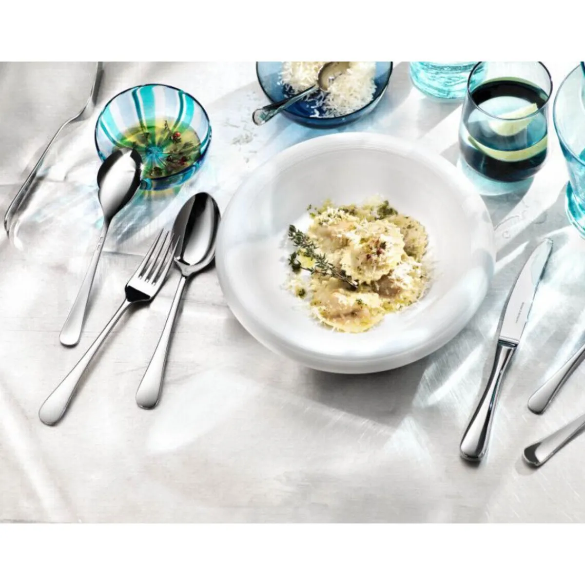- mit einem nach hinten verlagerten Schwerpunkt, um die Berührung zwischen Klinge und Tischtuch zu vermeiden