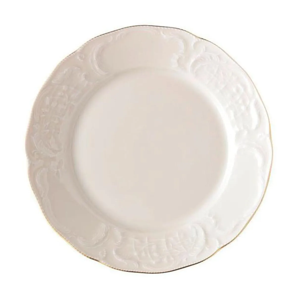 Genießen Sie ein abwechslungsreiches Frühstück auf dem Frühstücksteller der Serie Sanssouci Elfenbein Gold von . Mit der sorgfältig verzierten Fahne und dem ruhigen Spiegel, lässt es sich auf diesem Schmuckstück wunderbar schlemmen und genießen. Die goldene Kontur, die sich verspielt um die Fahne zieht, bildet ein schimmerndes Gegenüber zum ruhigen Elfenbein des Tellers.