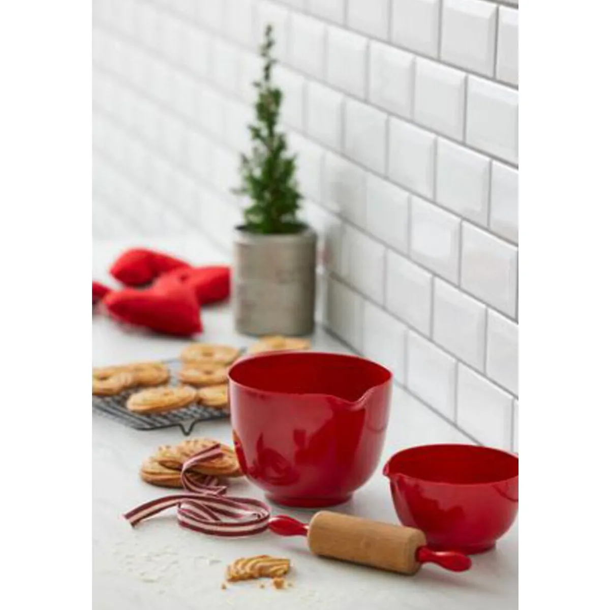 Die Rührschüssel Margrethe New Rot von bringt ein leuchtendes Rot in Ihren Küchenalltag und begeistert durch ihre hohe Funktionalität. Die stabile Konzeption steht auf einem rutschfesten Gummiring und weist Kratzer sowie Schäden resistent ab.