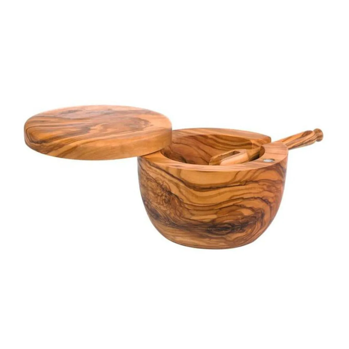 - Salzbehälter mit Deckel und Löffel aus massivem Olivenholz gefertigt