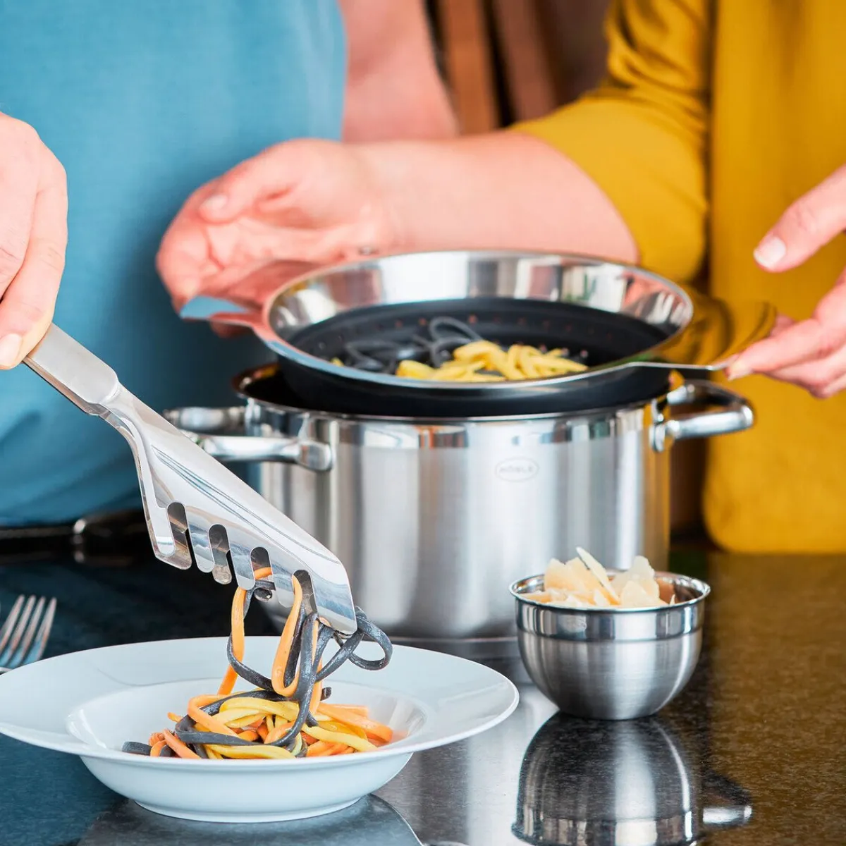 Mit dem praktischen Seiher von gelingt das Absieben von gekochten Nudeln und das Waschen von frischen Salaten mühelos.