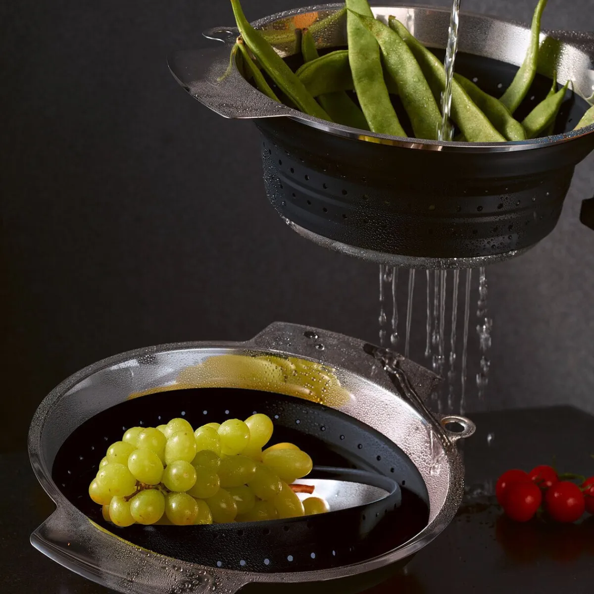 - faltbarer, schwarzer Seiher aus Edelstahl und Silikon gefertigt