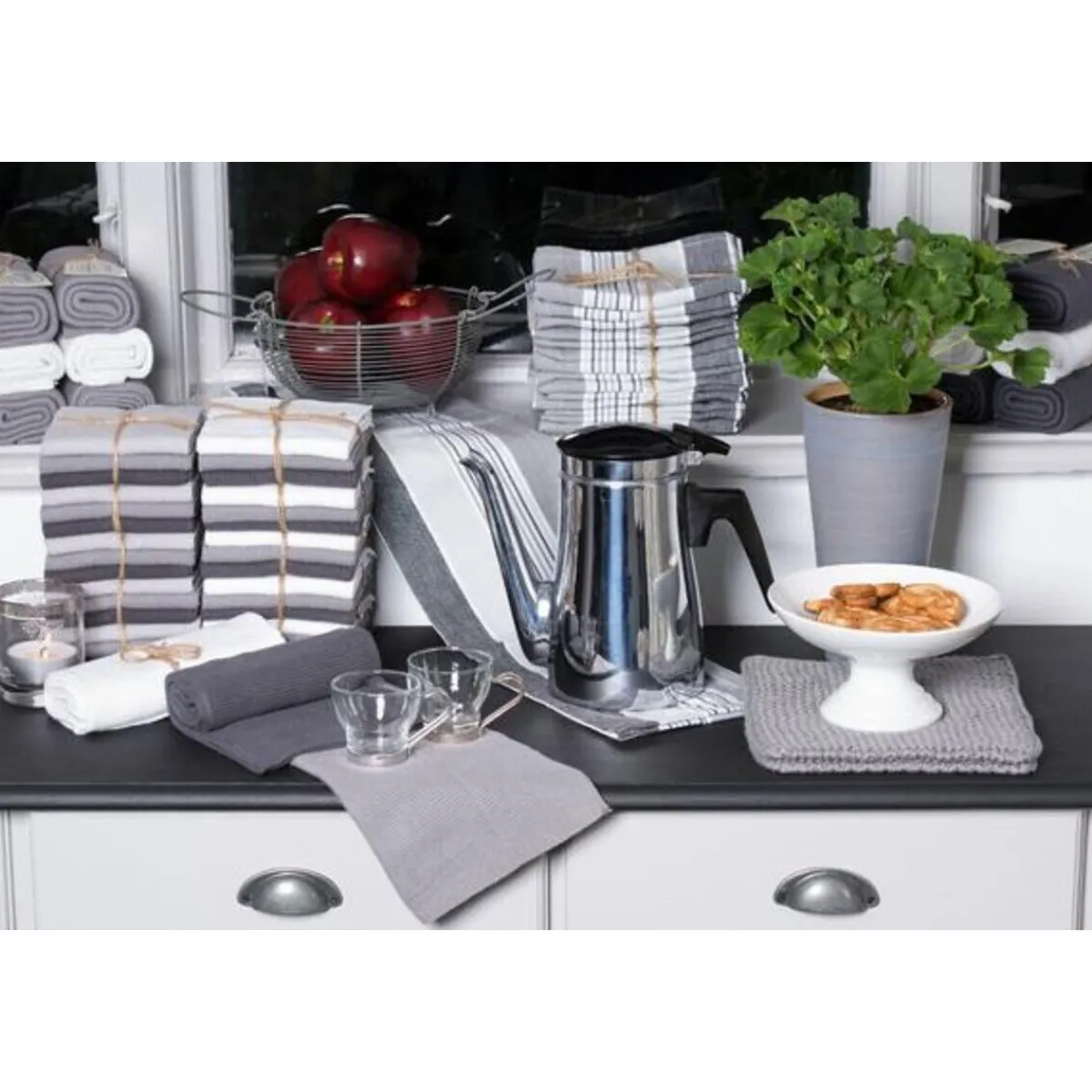 Die liebevoll gestrickten Wischtücher des dänischen Herstellers erweitern Ihr Zuhause um drei unterschiedlich stark stürmende Grautöne. Blitzschnell wischen Sie mit den widerstandsfähigen und saugstarken Tüchern über Anrichten und Waschbecken oder die Küchenzeile.
