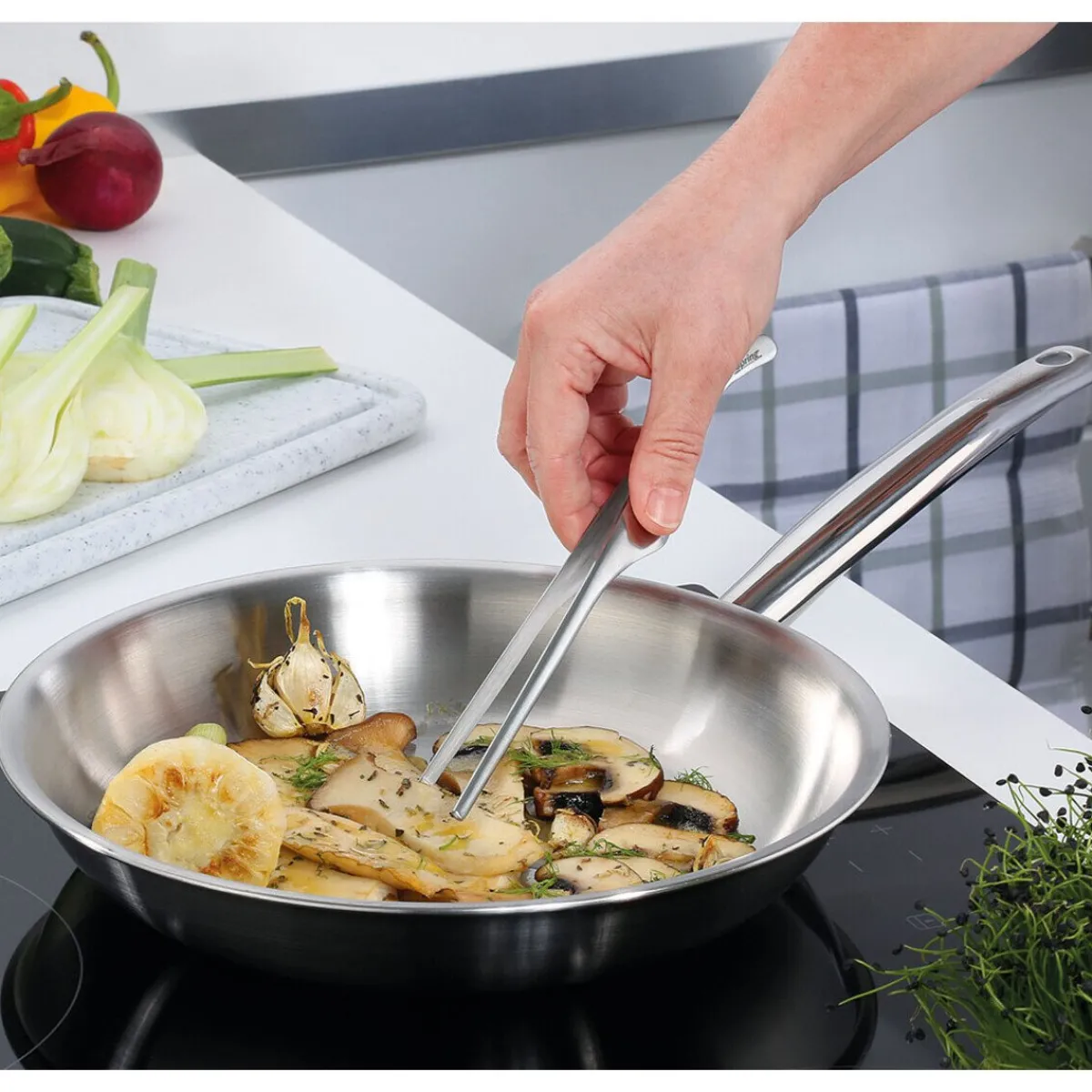- 5-Lagen-Mehrschichtmaterial aus Edelstahl und Aluminium garantiert eine optimale Wärmeverteilung
