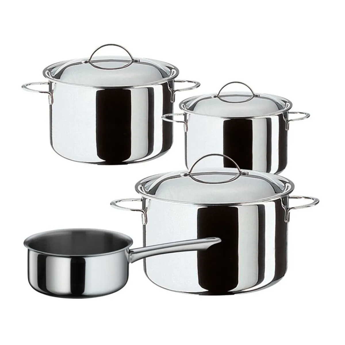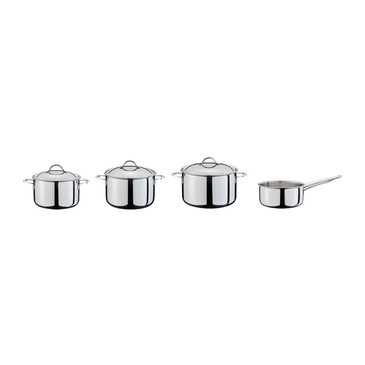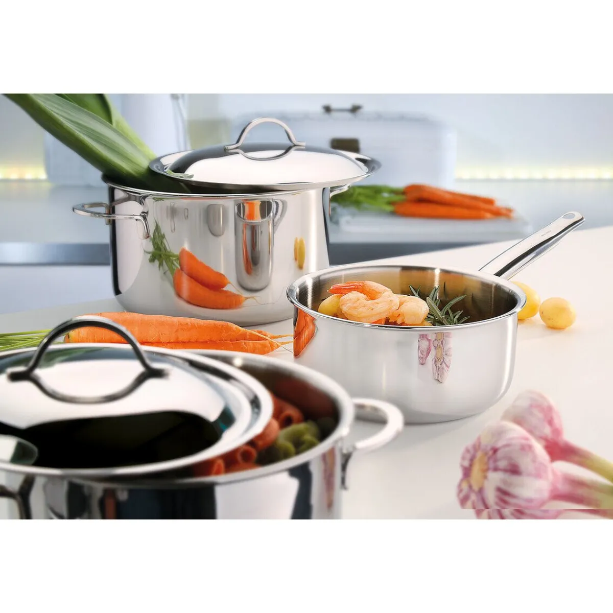- bestehend aus: Fleisch- und Gemüsetopf (16 cm), Fleisch- und Gemüsetopf (18 cm), Fleisch- und Gemüsetopf (20 cm), Stielkaserolle ohne Deckel (16 cm)