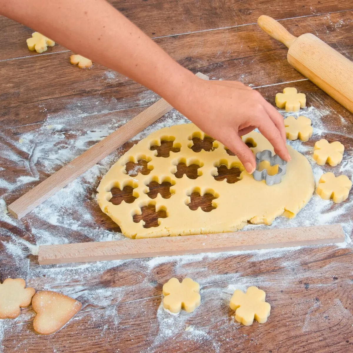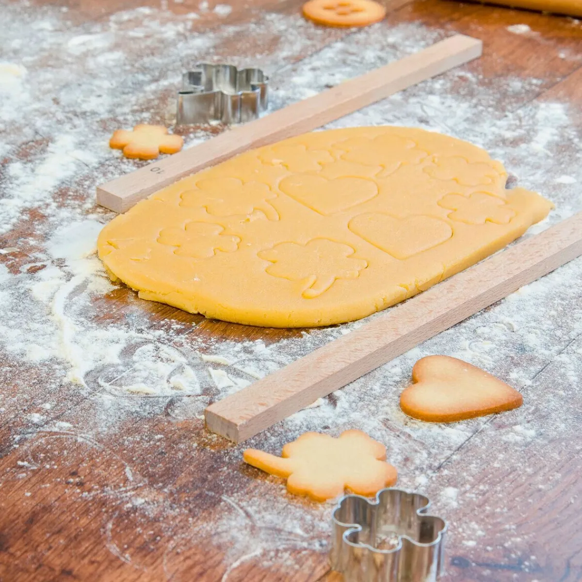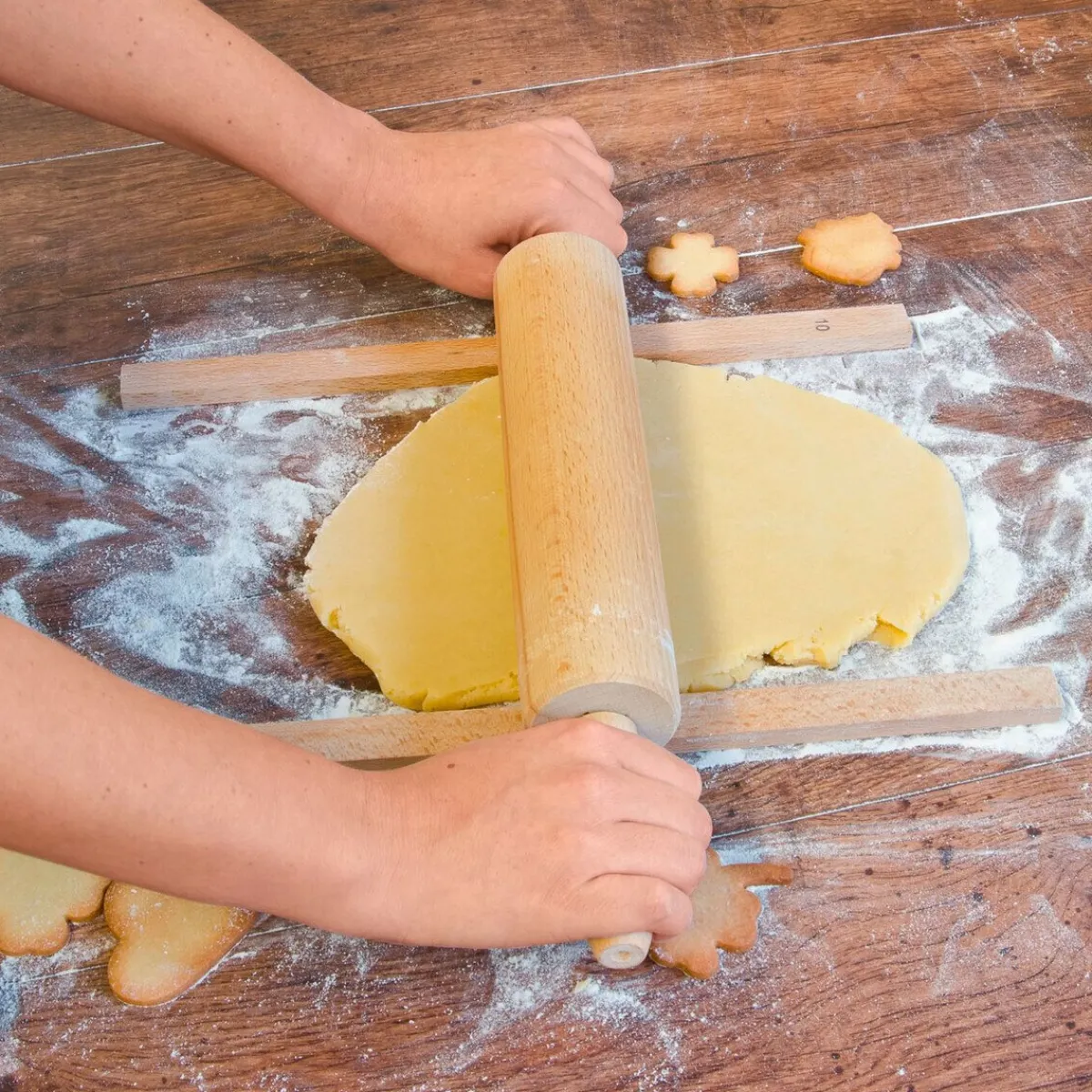 - einfach neben den Teig legen und das Nudelholz auf den Hölzern ablegen, dann ausrollen