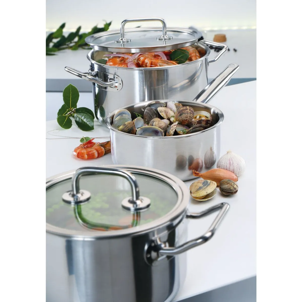 - Außenschicht aus induktionsfähigem Edelstahl 18/0 und innere Edelstahlschicht 18/10 umgeben einen dreifachen Aluminiumkern