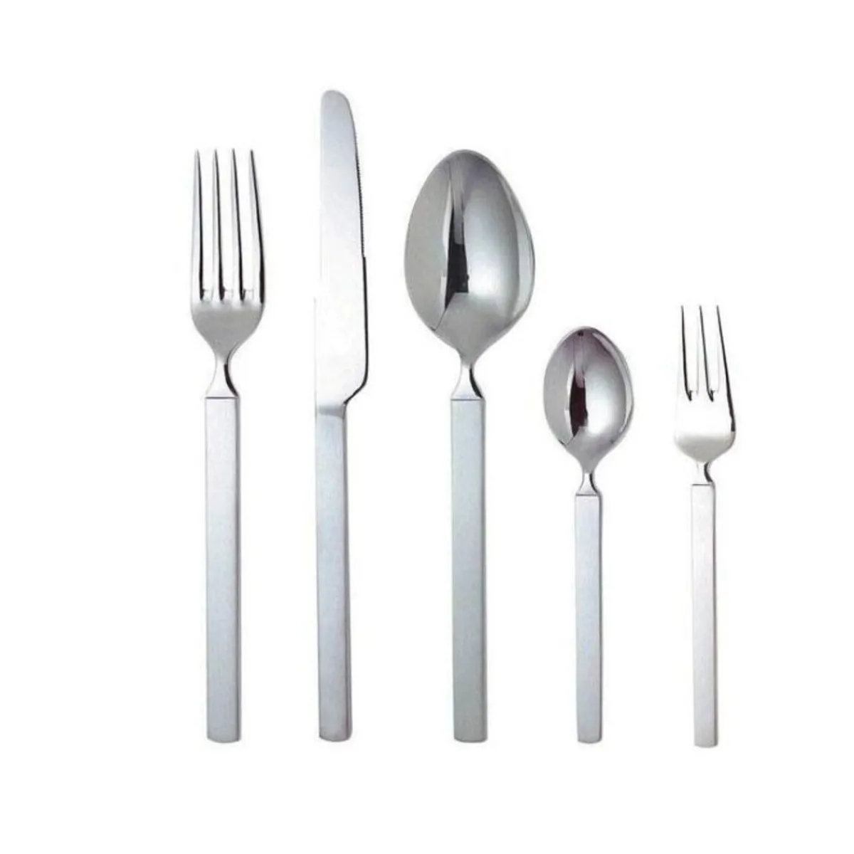Die kantig moderne Form der Besteckgarnitur Dry von wird durch die raffinierte Kombination aus polierter und matter Oberfläche hervorgehoben. Der Entwurf des italienischen Designers Achille Castiglioni betont den glänzenden Teil durch die matt polierten Griffe der Messer, Gabeln und Löffel. Das macht das Besteck so interessant und besonders, welches bereits seit 1982 zum festen Sortiment im Hause Alessi gehört.