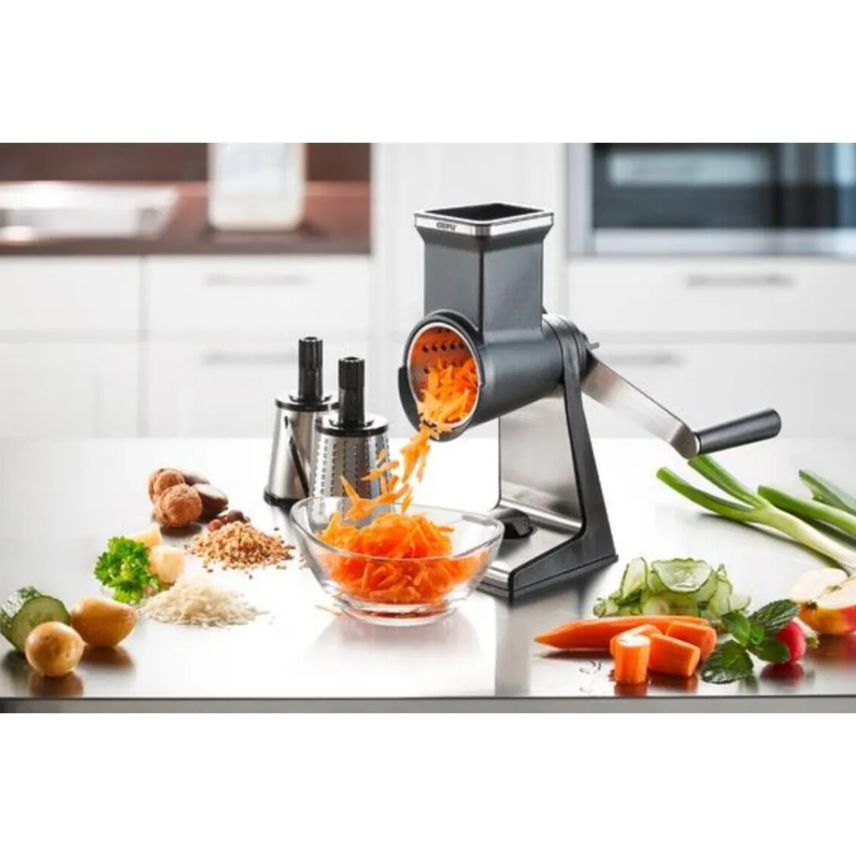 - 3 extra scharfe Laser Cut Trommeln: für feine Flocken, grobe Raspeln oder dünne Scheiben