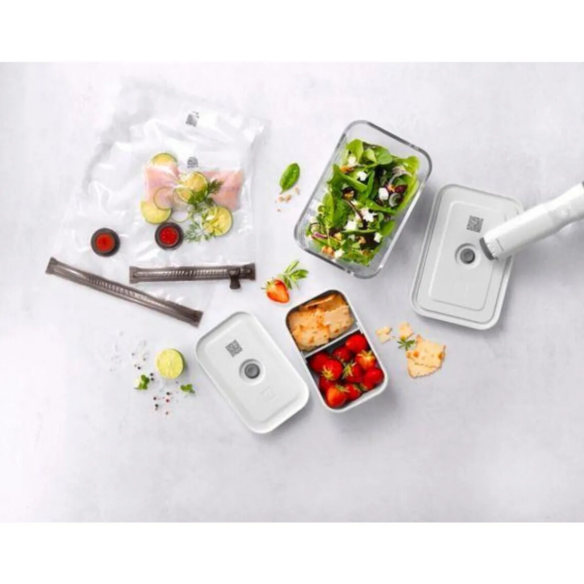 Lebensmittel lassen sich in den Beuteln aber auch sous-vide zubereiten oder in nur 30 Minuten marinieren. Das alles ist in Sekundenschnelle vorbereitet: Vakuum-Pumpe am Ventil andocken und auf Knopfdruck vakuumieren. Sie stoppt automatisch, sobald ausreichend Vakuum erzeugt wurde. Geschmack, Aromen und Vitamine werden durch diesen Vorgang zuverlässig bewahrt.Mit der Culinary World App von Zwilling haben Sie all Ihre Vorräte stets im Blick. Einfach den QR-Code auf den Vakuum-Boxen und -Beuteln scannen und sich erinnern lassen, sobald die vorgekochten Mahlzeiten oder Lebensmittel genossen werden sollten.