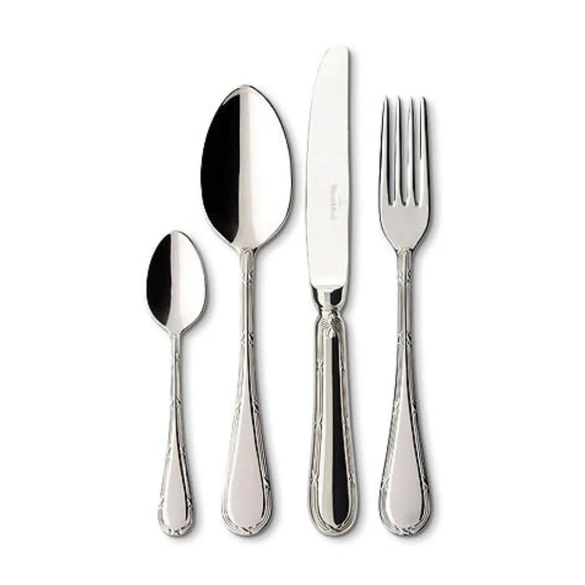 Mit diesem Essbesteck lassen sich Mahlzeiten stilvoll genießen. Bei Feierlichkeiten oder in alltäglichen Situationen leistet es hervorragende Dienste und harmoniert mit jedem Geschirr. Das 24-teilige Tafelbesteck von Villeroy & Boch besteht aus sechs Tafelmessern, sechs Tafelgabeln, sechs Tafellöffeln und sechs Kaffeelöffeln. Es hat eine polierte Oberfläche und überrascht mit einer romantischen Prägung, die sofort ins Auge fällt. Die aparte Besteckgarnitur aus der Serie Kreuzband Septfontaines wurde aus solidem Edelstahl angefertigt und ist für die Spülmaschine geeignet.