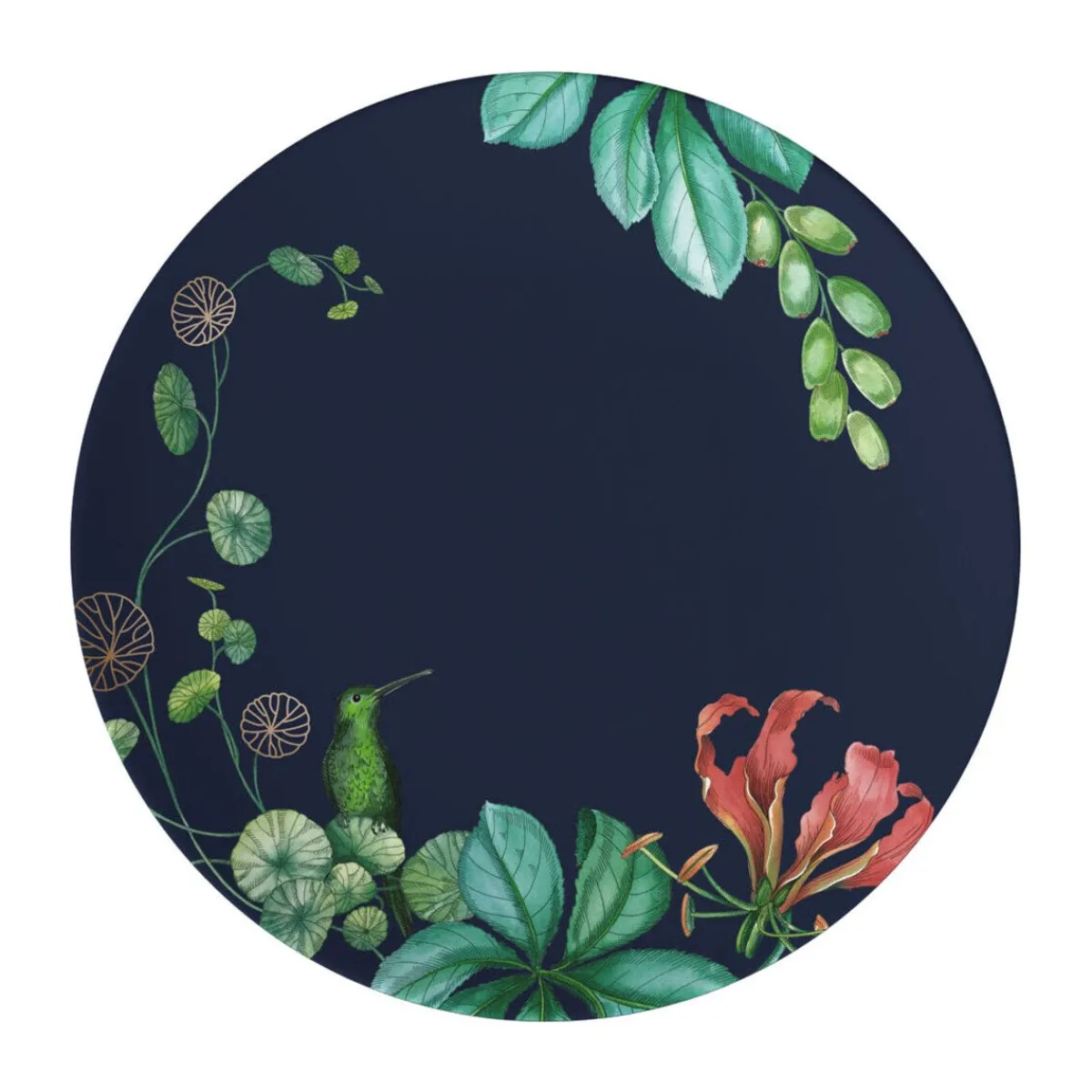 Der Frühstücks-/Dessertteller Avarua von ist von einem mystischen Schwarz geprägt, das von ausdrucksstarken Farben belebt wird. Ein Kolibri, prachtvolle Blüten und feingliedrige Blätter zieren die Oberfläche und schmeicheln Ihren Köstlichkeiten. Kredenzen Sie Ihre Speisen mit floraler Anmut.
