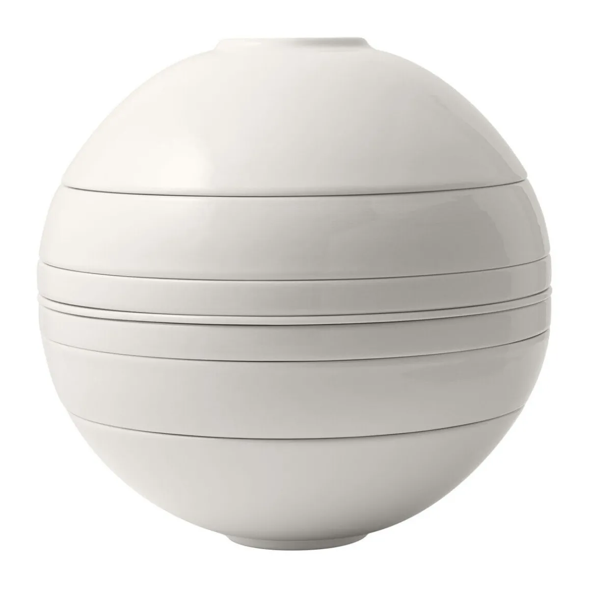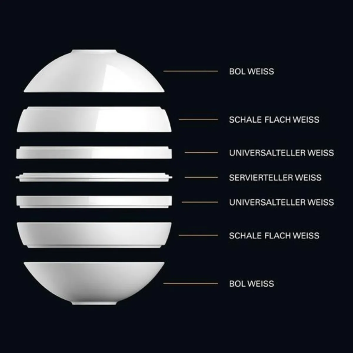 Das Besondere an dem Geschirr-Set La Boule Iconic White von ist, dass aus ihm ganze sieben Geschirrteile hervorgehen, die sich zu einer dekorativen Kugel zusammensetzen lassen. Platzsparend, designästhetisch und minimalistisch ausgestaltet, zieht das Set alle Blicke auf sich.