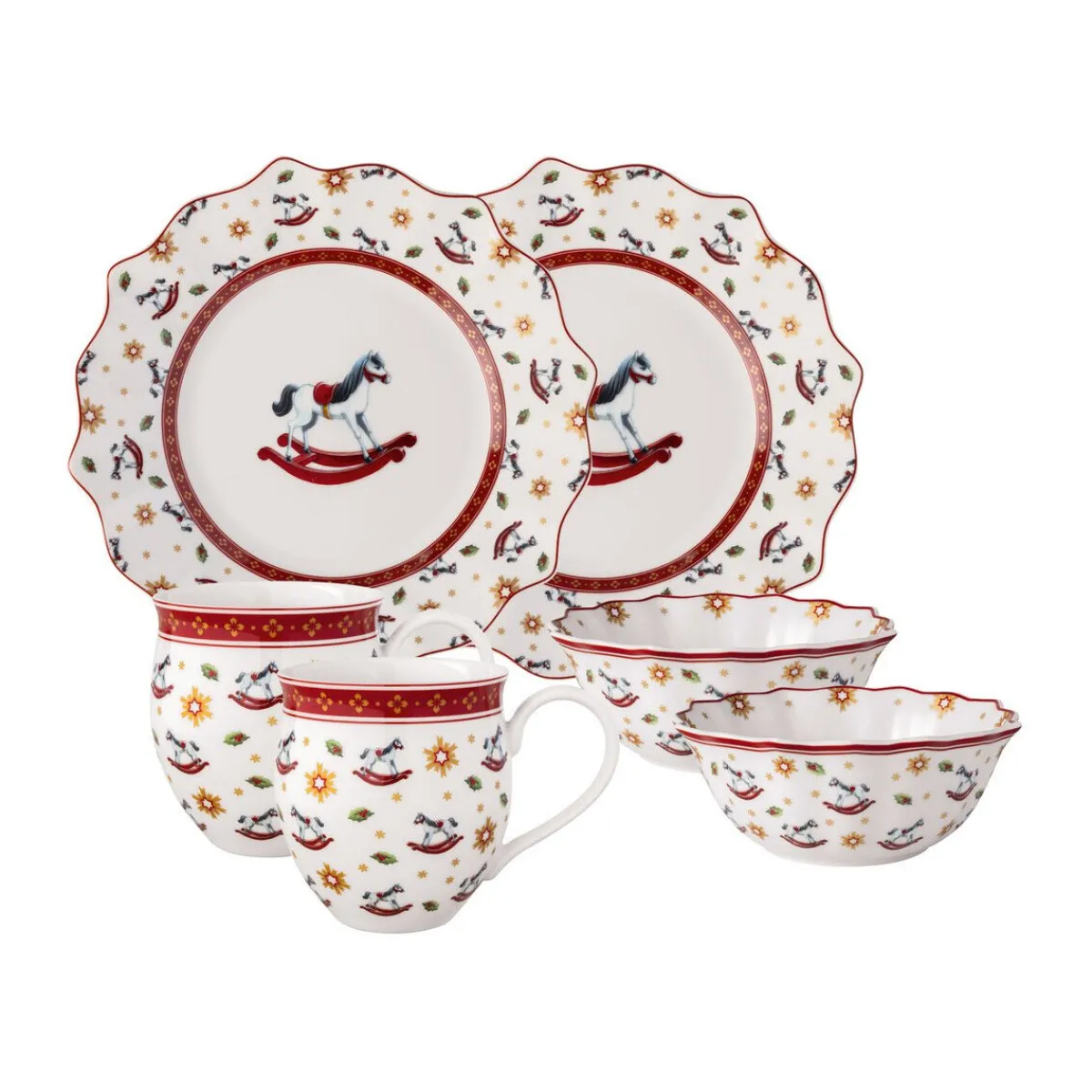 Mit dem Frühstücksset Schaukelpferd Toy’s Delight von starten Sie stimmungsvoll und gemeinsam mit Ihrem Lieblingsmenschen in die Festtage. Im Mittelpunkt des verspielten Dekors steht das Schaukelpferd – eines der beliebtesten Motive der Toy’s-Delight-Serie – mit neu interpretierten Facetten. Filigran und gestreut angeordnet oder als zentraler Blickfang – dieses Schaukelpferd galoppiert mit Ihnen voller Freude in die Weihnachtszeit. Sorgen Sie mit diesem Geschirr-Set für ein nostalgisches Advents-Feeling und ein kindliches Staunen.