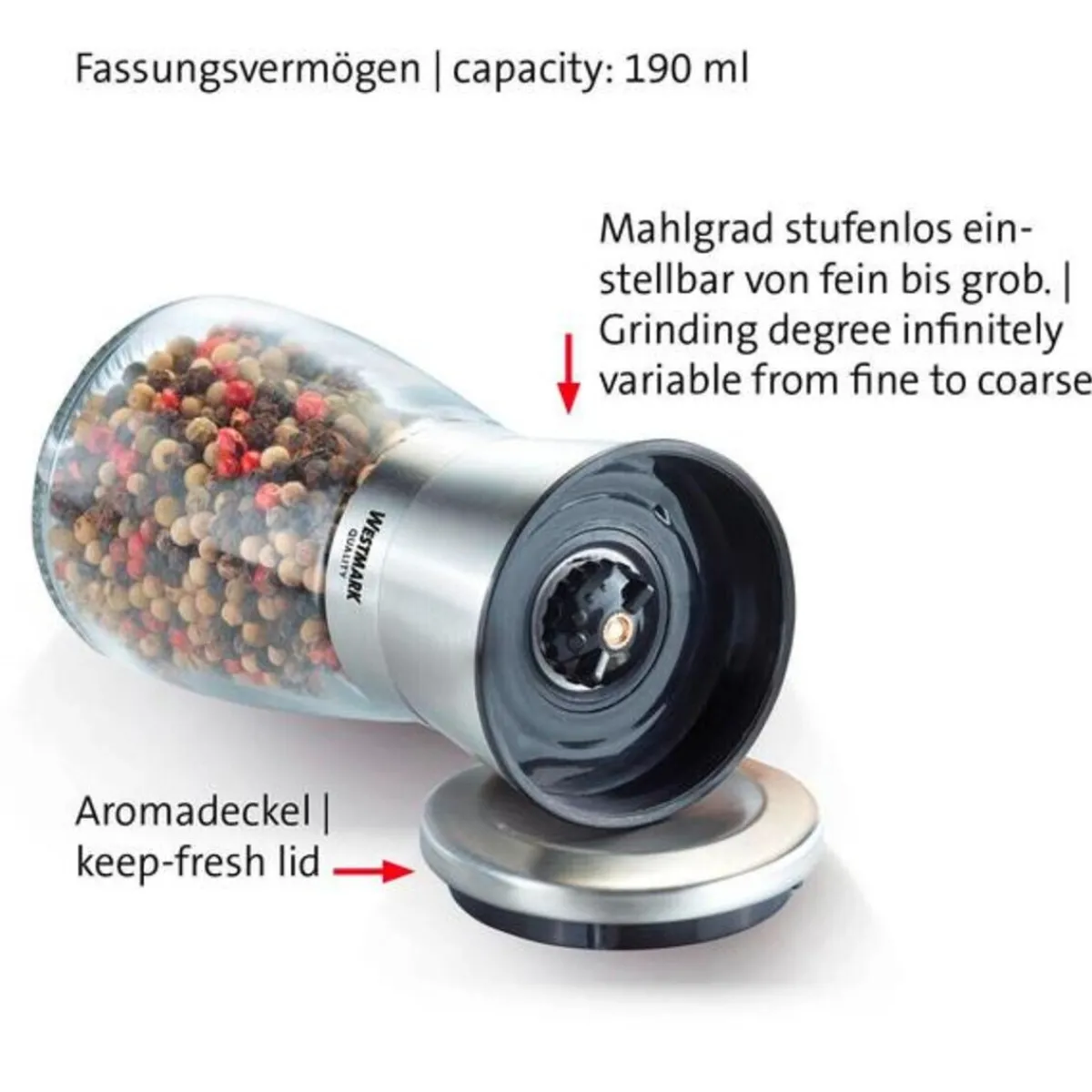 Mit der praktischen Gewürzmühle Edelstahl von wird das Würzen Ihrer Speisen zu einem Kinderspiel. Durch das robuste Mahlwerk aus Keramik ist ein kräfteschonendes, leichtgängiges Mahlen möglich, das Ihren Speisen den nötigen Pfiff verleiht.