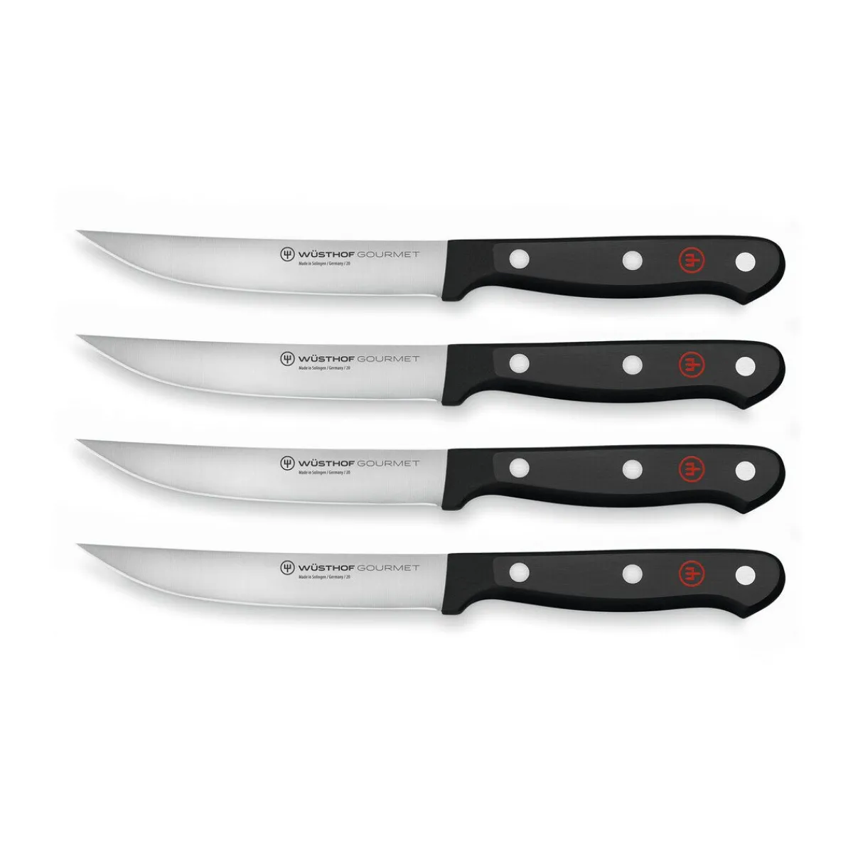 Mit dem Steakmesser-Set Gourmet von sind Sie für den nächsten Grillabend hervorragend ausgerüstet. Die scharfe Klinge gleitet gekonnt durch saftige Steaks und mageres Fleisch, ohne die Fasern zu beschädigen. Sorgen Sie mit diesem Messer für saubere Schnittbilder und ein kräfteschonendes Schneiden, wann immer Sie Fleisch reichen.