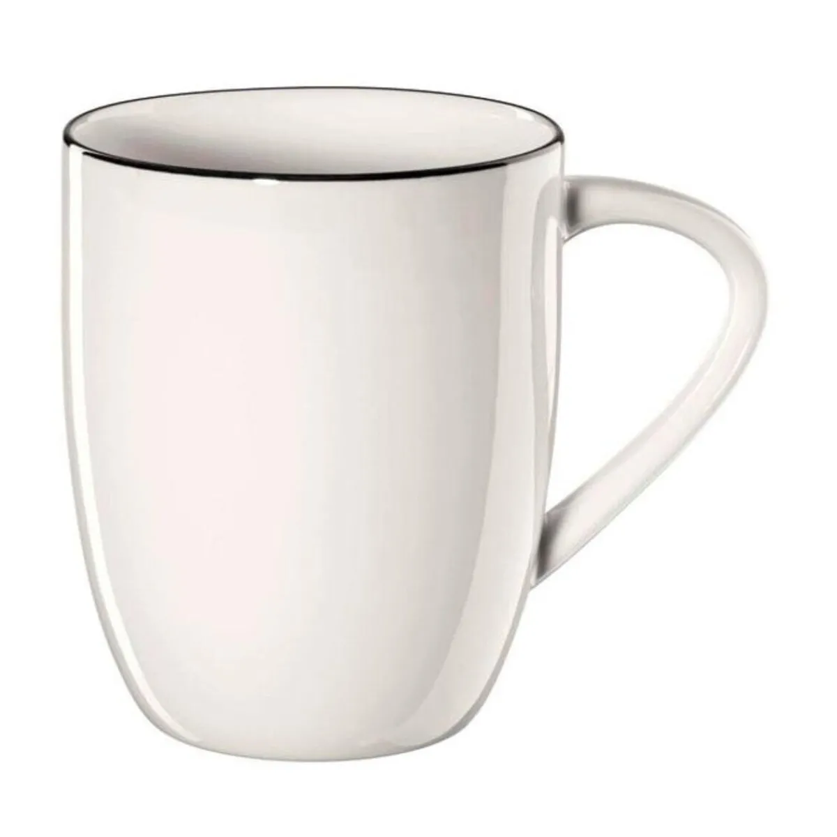 Ob für den Kaffeegenuss am Morgen oder einen heißen Tee am Nachmittag – dieser Henkelbecher von überzeugt im schlicht-eleganten Design mit handbemalter, schwarzer Linie. Der Becher ist Teil der Serie à table ligne noire und aus hochwertigem Fine Bone China Porzellan gefertigt. Das Volumen des Henkelbechers beträgt 350 ml, bei einer Höhe von 9 cm und einem Durchmesser von 8,5 cm.