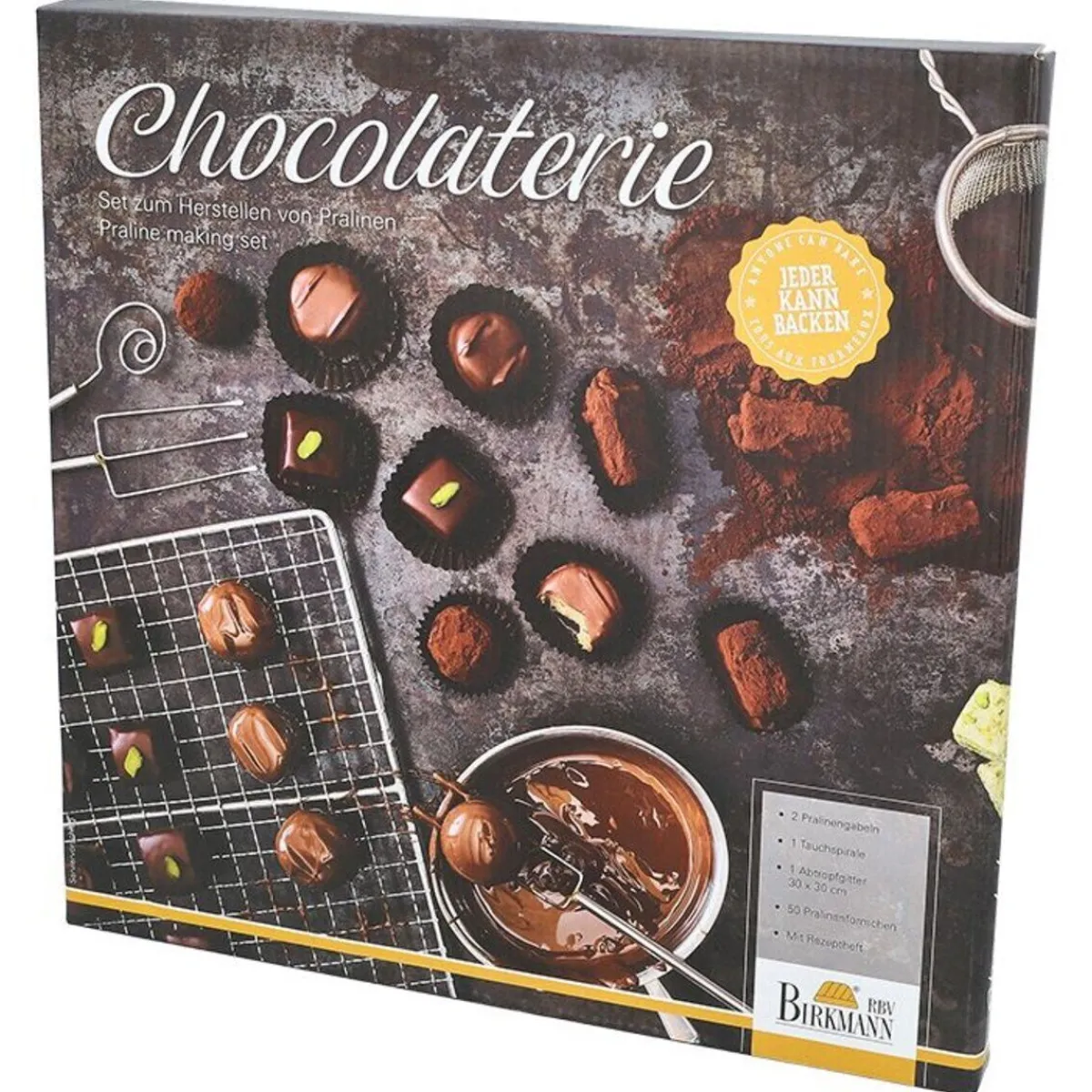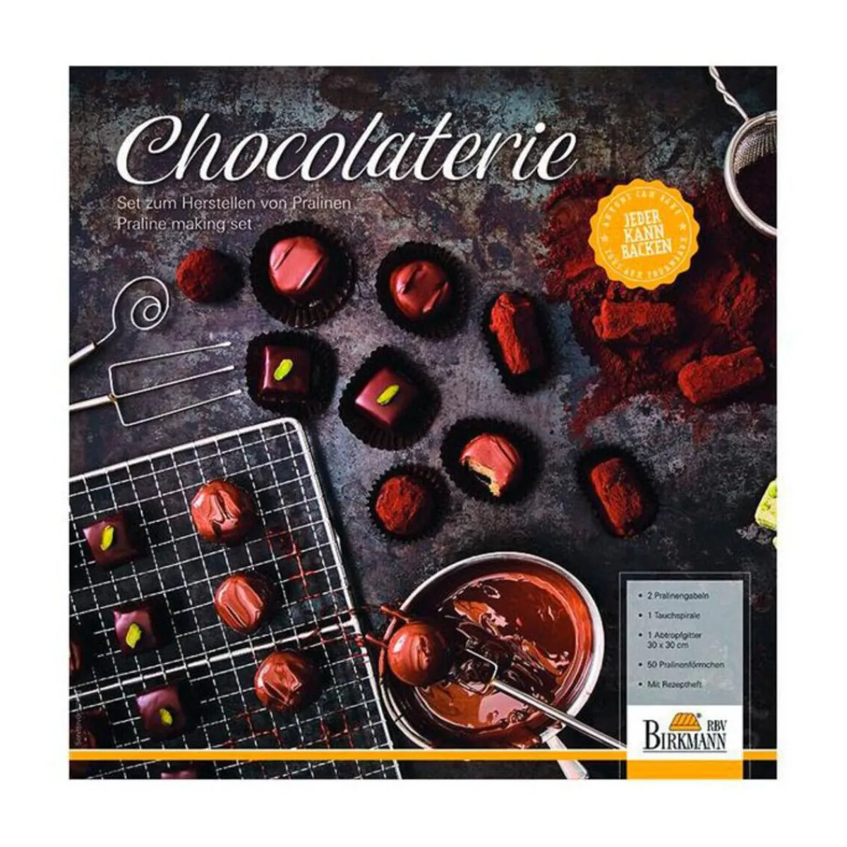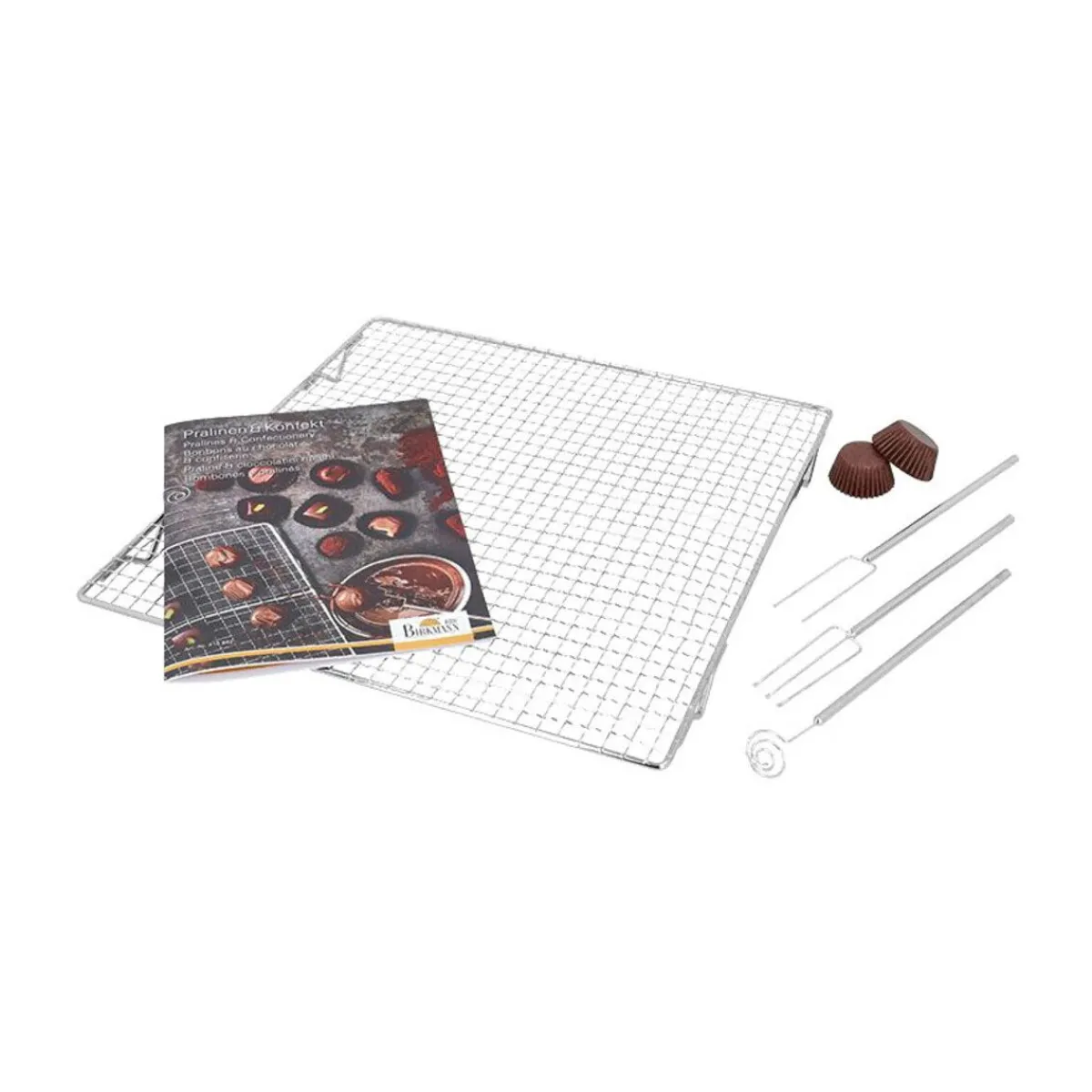 - mit 1x Abtropfgitter (30×30 cm), 2x Pralinengabel, 1x Tauchspirale, 50 Papierförmchen, 1x Rezeptheft