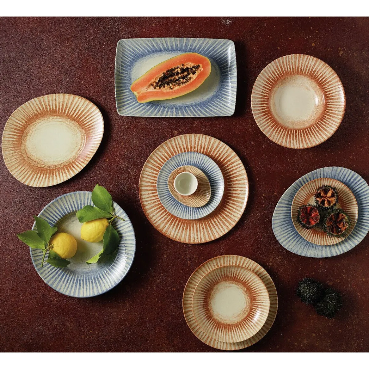 Die Platte Sunlight Red von umspielt Ihre Kuchenstücke, Snacks und Häppchen mit dem rötlichen Charme einer aufgehenden Sonne. Die farbintensiven Streifen treten mal heller und mal dunkler in Erscheinung, wodurch ein einzigartiger Look entsteht, der eine optische Tiefe kreiert und Ihr Fingerfood in den Mittelpunkt stellt. Kredenzen Sie Ihre raffinierten Köstlichkeiten auf dieser Servierplatte mit einem erdenden Ausdruck.