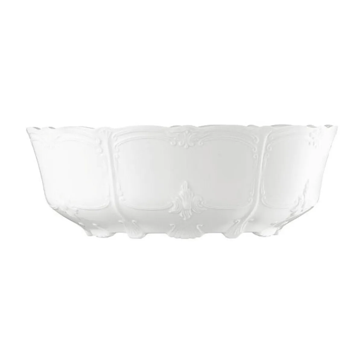Die Schüssel der Geschirrserie Baronesse Weiß von tritt klassisch in Erscheinung. Das feine Relief mit präzise ausgearbeiteten Zierelementen verleiht der Servierhelferin einen romantischen Look.