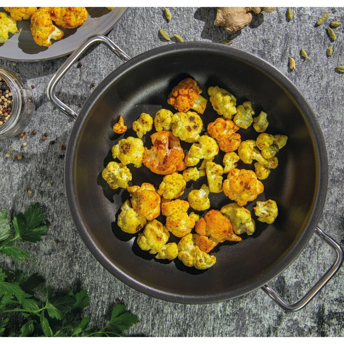 Empfindliche Gerichte wie Fisch- und Mehlspeisen gelingen Ihnen auf der mineralischen Antihaftbeschichtung der Servierpfanne der Serie Vulcano von mühelos und ohne anzukleben. Auch zum Überbacken, Garen und zum Warmhalten von Speisen im Backofen ist die Pfanne verwendbar.